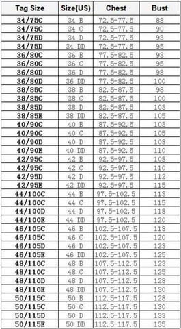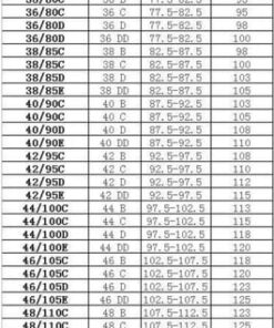 Jostas izmērs , kausa izmērs : 34A , 34B , 34C , 34D , 34E , 36A , 36B , 36C , 36D , 36E , 38B , 38C , 38D , 40C , 40C , 40C , 42C , 42D , 42E , 44C , 44D , 44E , 46D , 46E